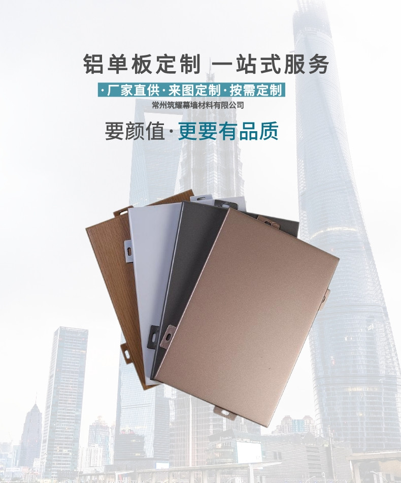 常州筑耀铝单板幕墙厂家是一家专业的铝单板生产厂家,主要致力于幕墙铝单板,氟碳铝单板,冲孔铝单板,木纹铝单板,仿石材铝单板,镂空铝单板,外墙铝单板,吊顶铝单板制作定制.铝单板规格齐全,筑耀铝单板厂家服务全国区域:江苏,浙江,安徽,山东及周边城市:上海,南京,苏州,无锡,徐州,常州,杭州